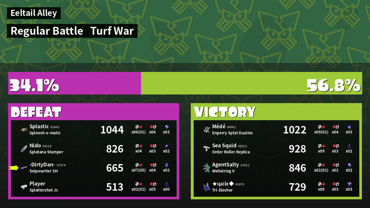 | Medals | #1 Overall Splatter #1 Splat Assister #1 Base Defender | ||