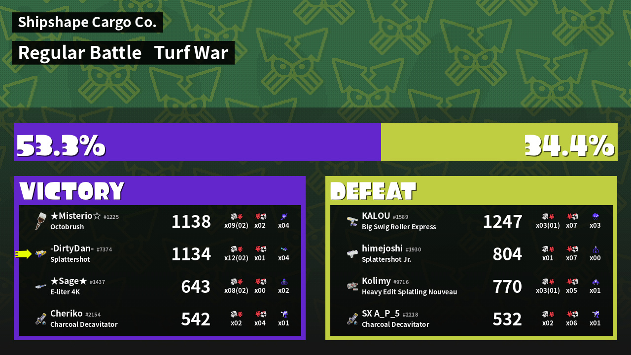 | Medals | #1 Overall Splatter #1 Enemy-Base Inker #1 Enemy Splatter | ||