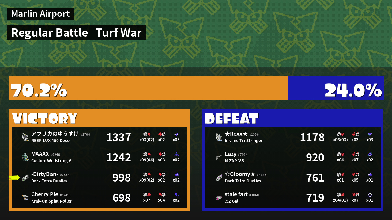 | Medals | #1 Overall Splatter #1 Enemy Splatter #2 Home-Base Inker | ||