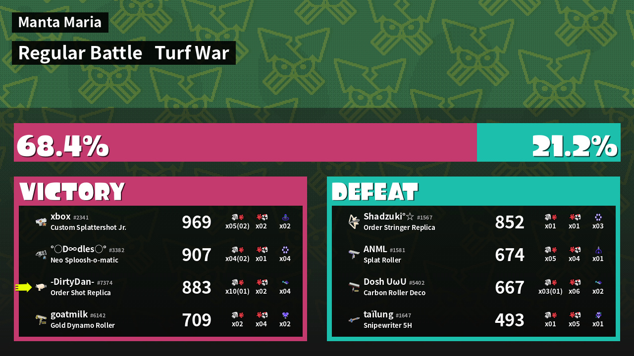 | Medals | #1 Overall Splatter #1 Popular Target #1 Enemy-Base Inker | ||