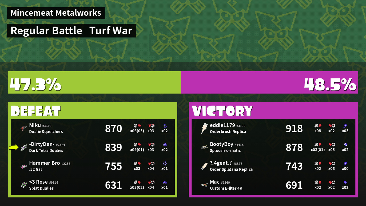 | Medals | #1 Overall Splatter #1 Popular Target #1 Enemy-Base Inker | ||