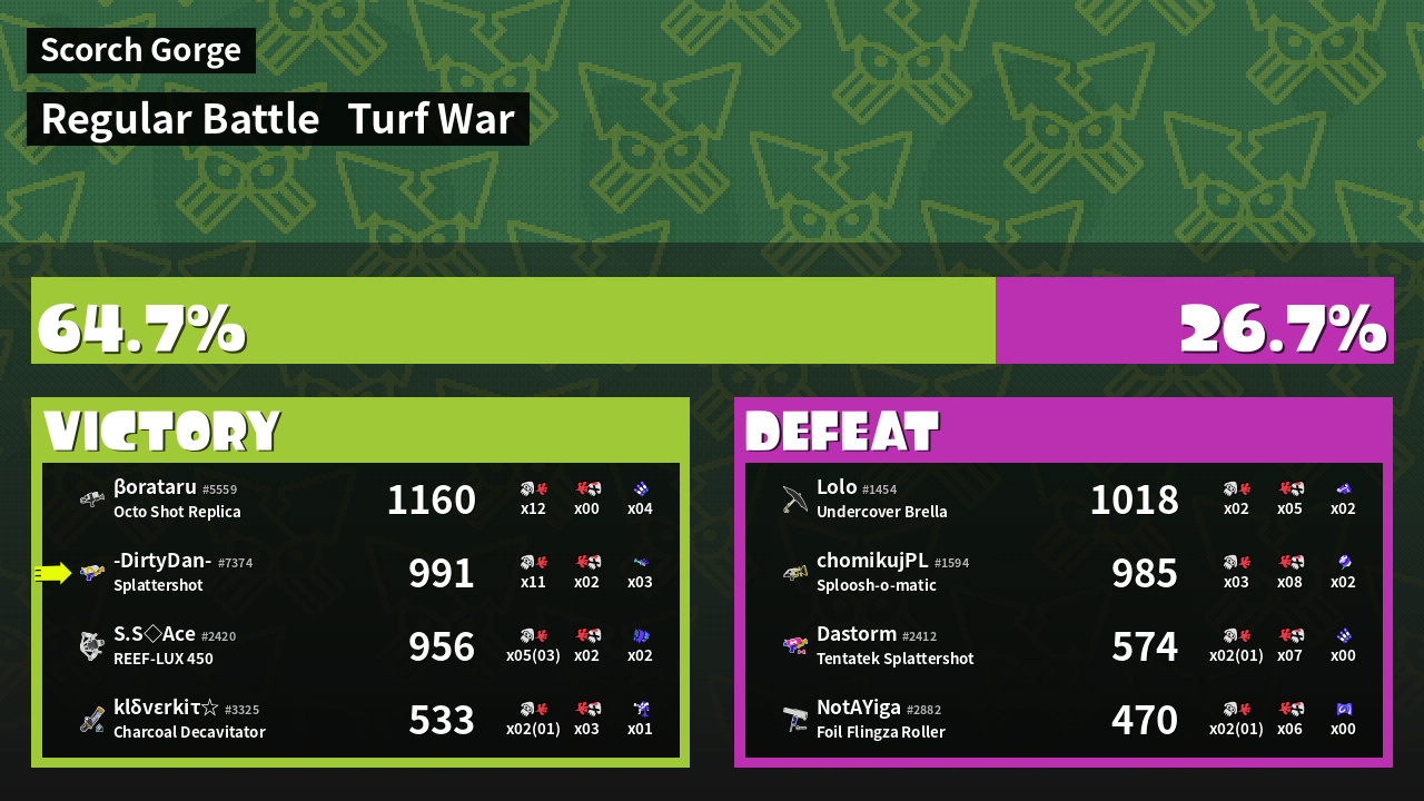 | Medals | #1 Popular Target #1 Enemy-Base Inker #1 Damage Taker | ||