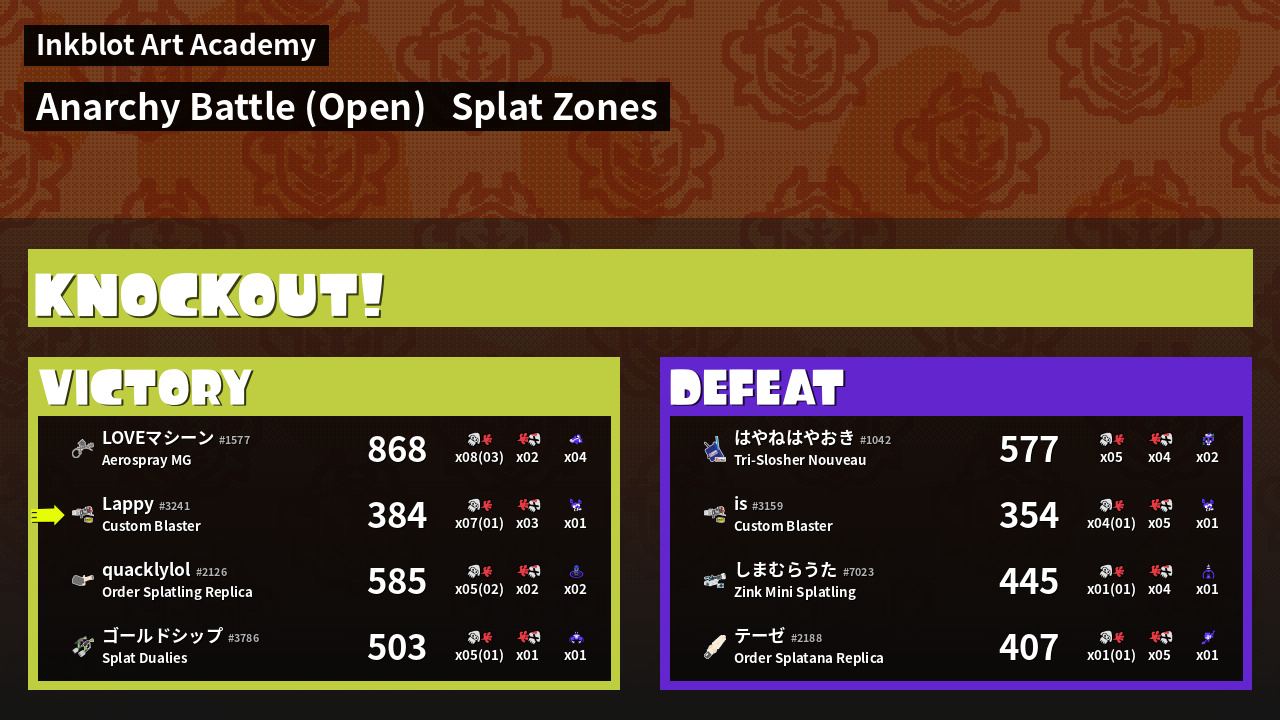 | Mode | Splat Zones - Anarchy Battle (Open) |