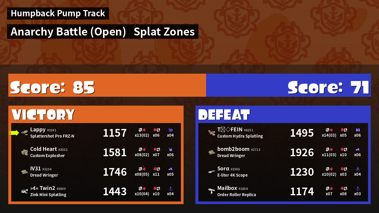 | Mode | Splat Zones - Anarchy Battle (Open) |