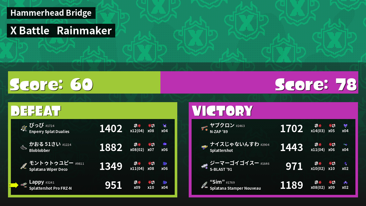 | Medals | #1 Enemy Splatter #1 Ink Consumer #2 Popular Target |