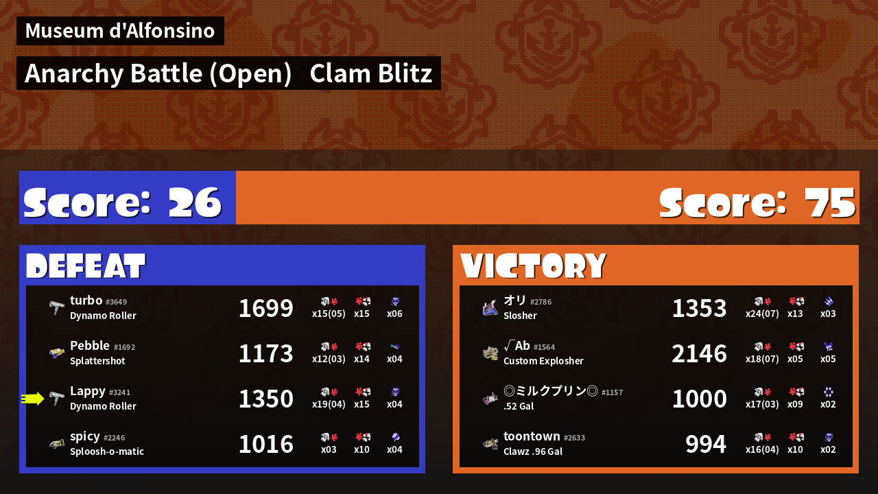 | Medals | #1 Overall Splatter #1 Enemy Splatter #1 Clam Stopper |