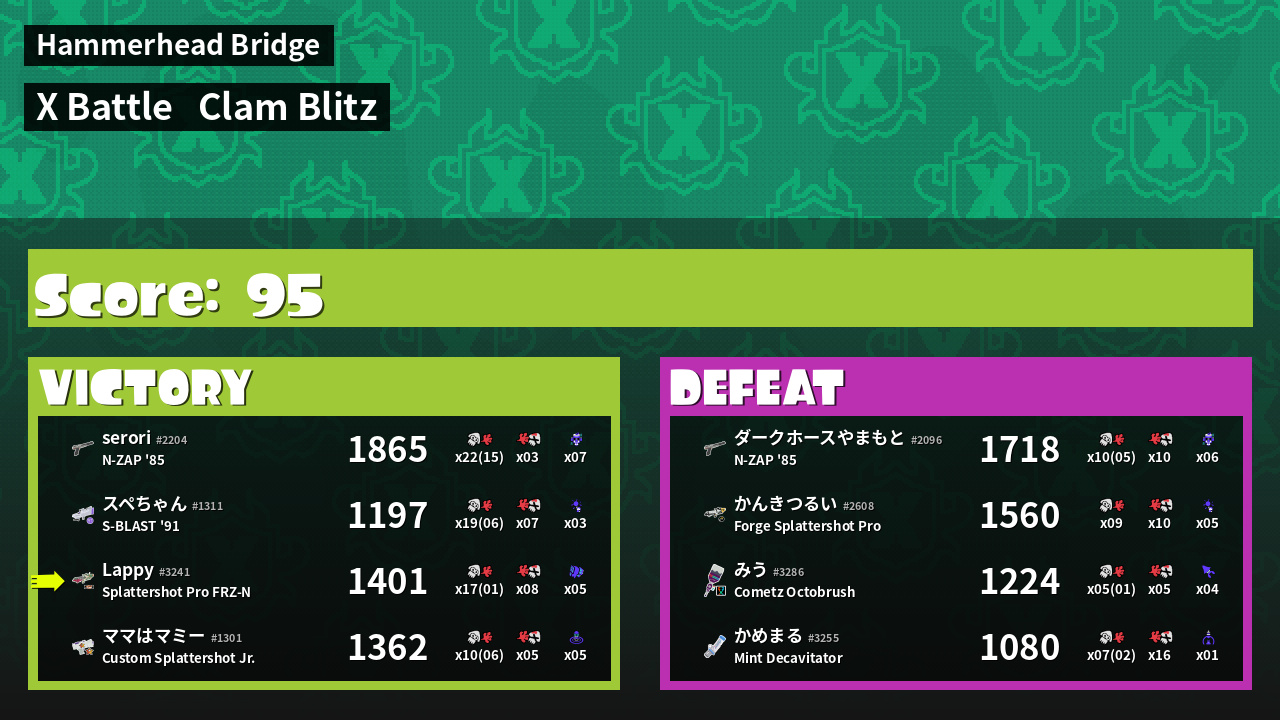 | Medals | #1 Enemy Splatter #1 Clam Stopper #1 Damage Taker |