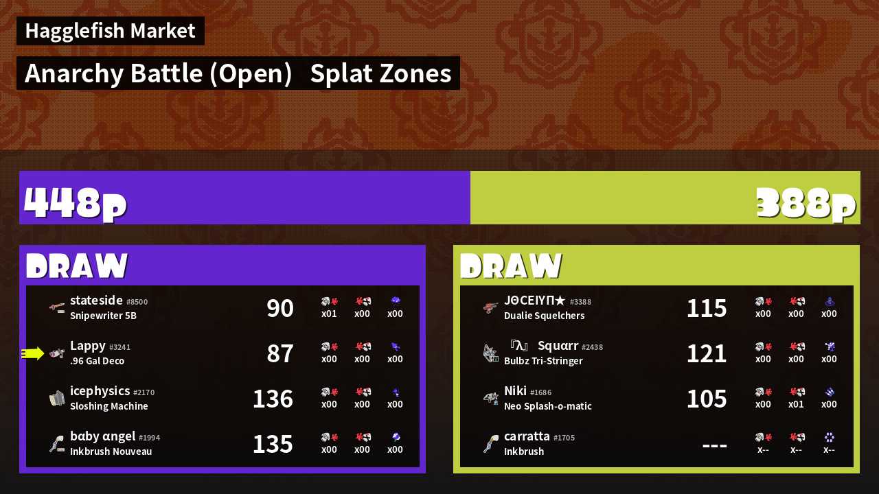 | Mode | Splat Zones - Anarchy Battle (Open) |