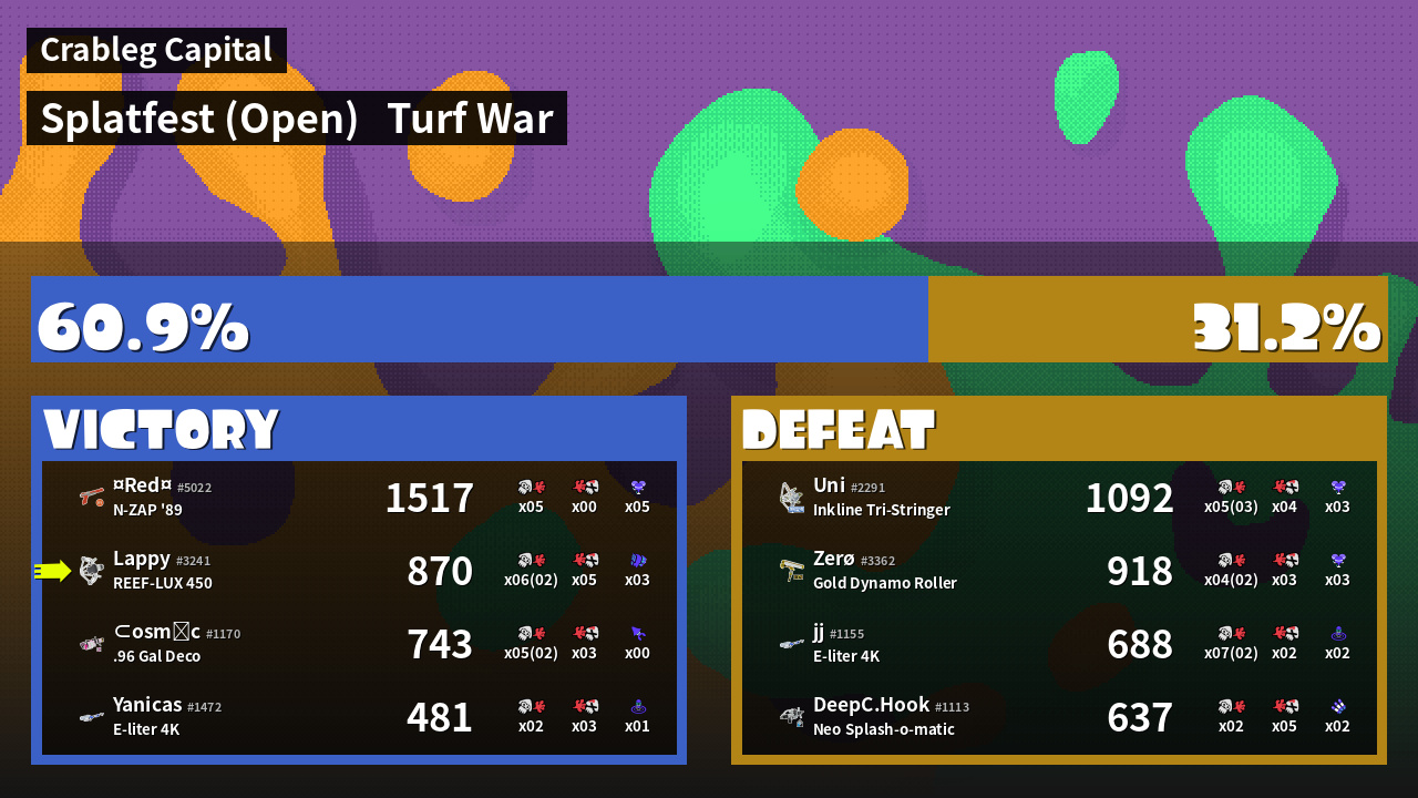 | Medals | #1 Overall Splatter #1 Home-Base Inker #1 Splat Assister |