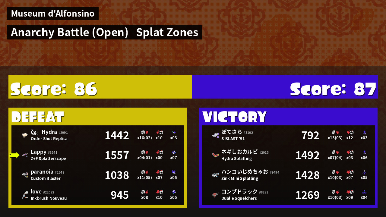 | Mode | Splat Zones - Anarchy Battle (Open) |