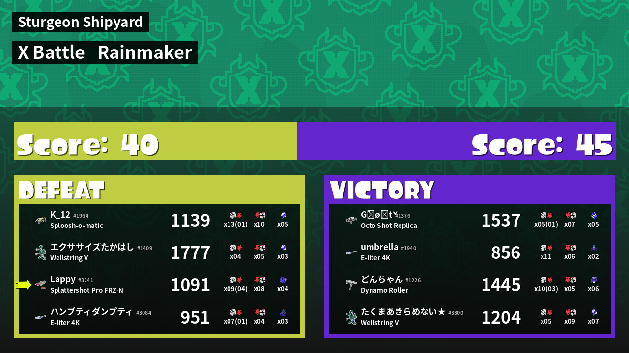 | Medals | #1 Splat Assister #1 Rainmaker Stopper #1 Damage Taker |