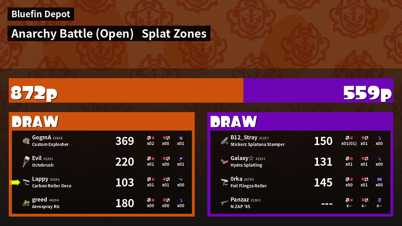 | Mode | Splat Zones - Anarchy Battle (Open) |