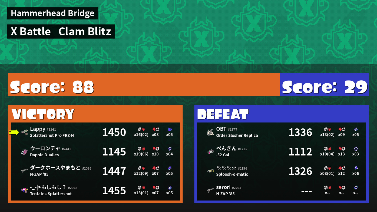 | Medals | #1 Clam Carrier #1 Popular Target #1 Enemy Splatter |