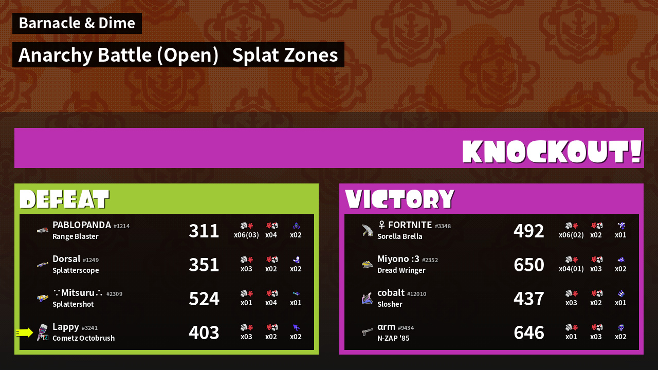 | Mode | Splat Zones - Anarchy Battle (Open) |
