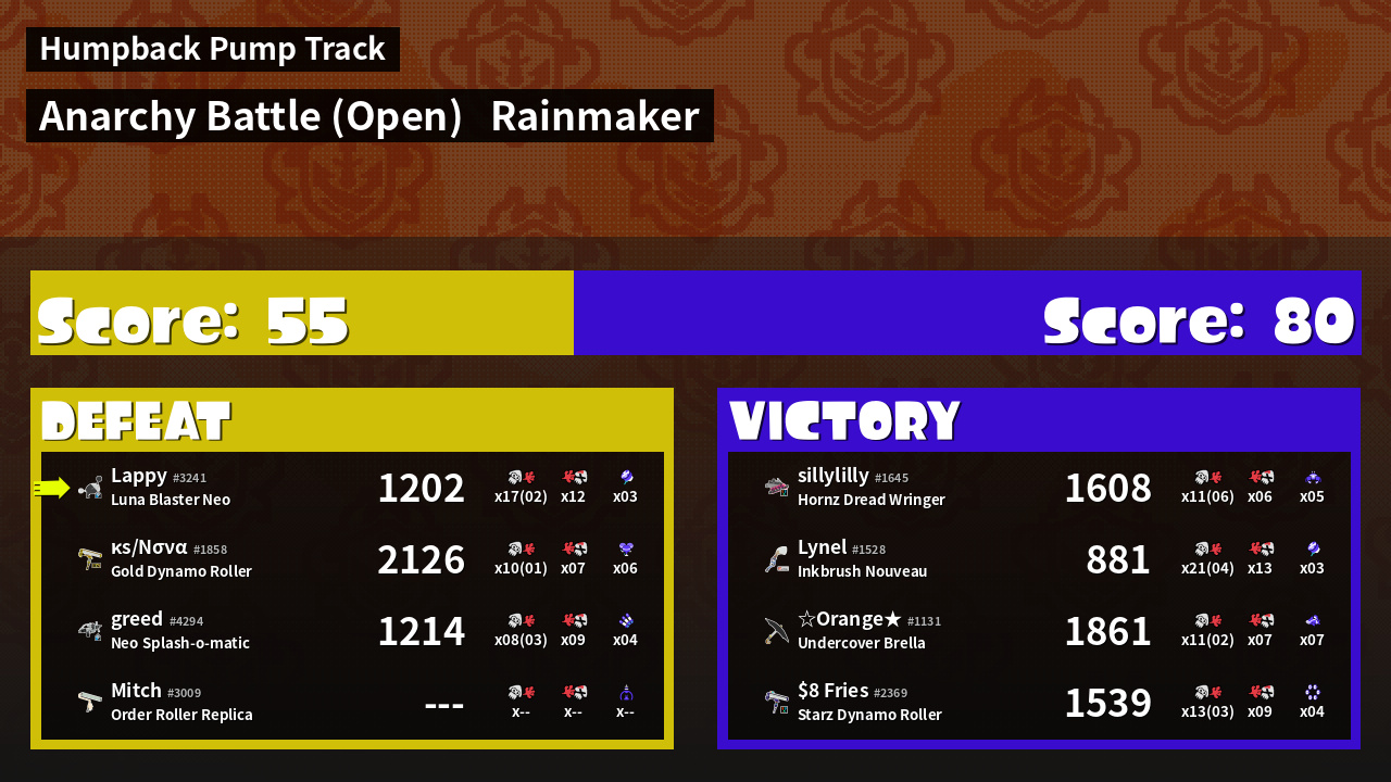 | Medals | #1 Overall Splatter #1 Super Jump Spot #1 Enemy Splatter |