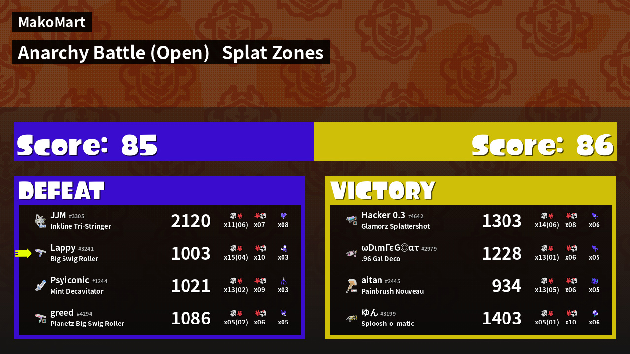 | Mode | Splat Zones - Anarchy Battle (Open) |