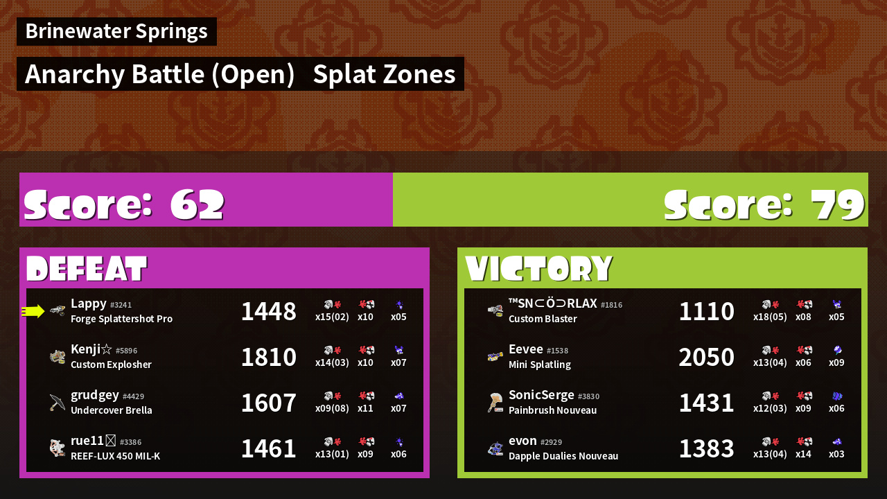 | Mode | Splat Zones - Anarchy Battle (Open) |