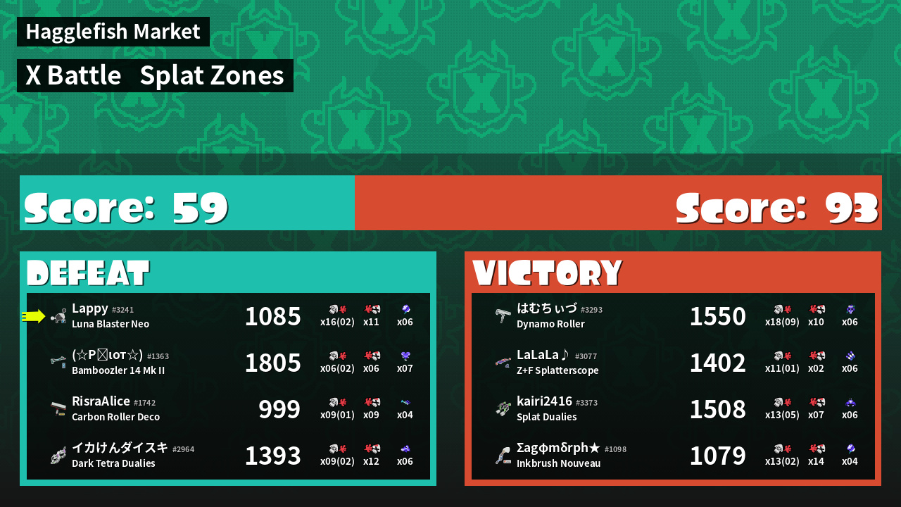 | Medals | #1 Overall Splatter #1 Splat Zone Guard #1 Enemy Splatter |