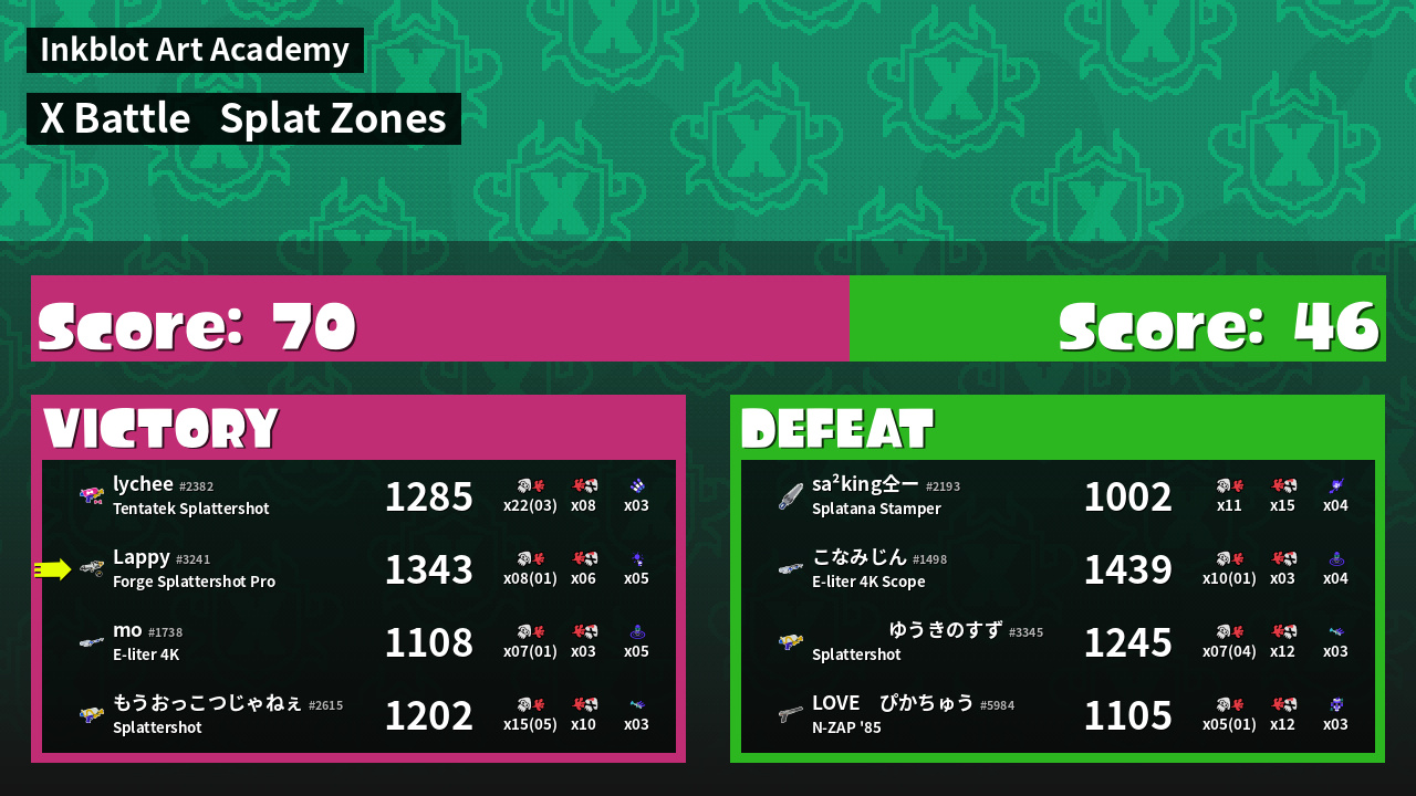 | Medals | #1 Splat Zone Inker #1 Turf Inker #1 Ink Consumer |