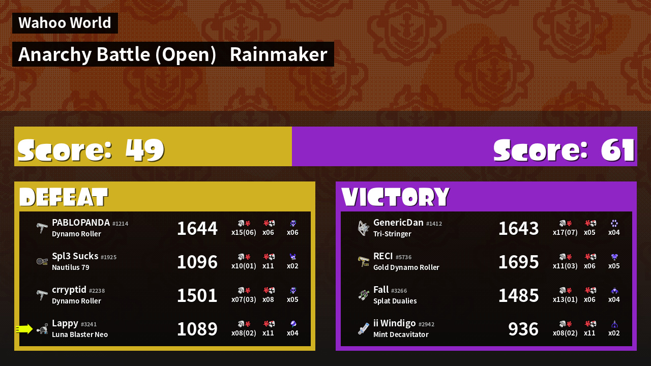 | Medals | #1 Rainmaker Stopper #1 Damage Taker #1 Ink Consumer |