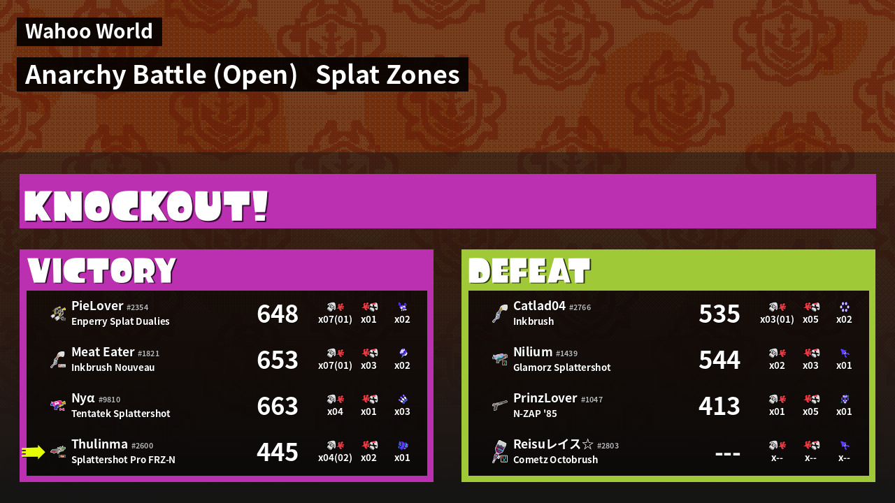 | Mode | Splat Zones - Anarchy Battle (Open) | ||