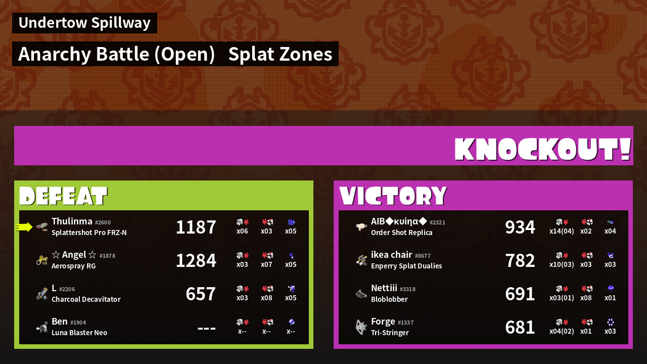 | Mode | Splat Zones - Anarchy Battle (Open) | ||