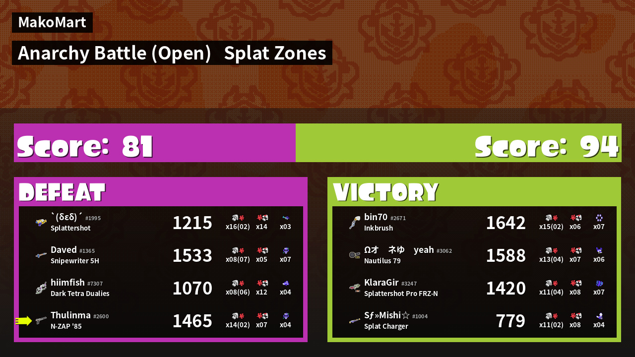 | Mode | Splat Zones - Anarchy Battle (Open) | ||