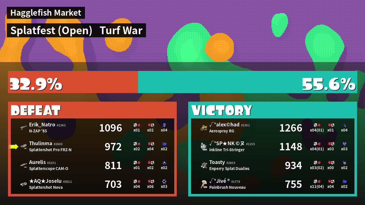 | Medals | #1 Base Defender #1 Tenta Missiles User #2 Overall Splatter | ||