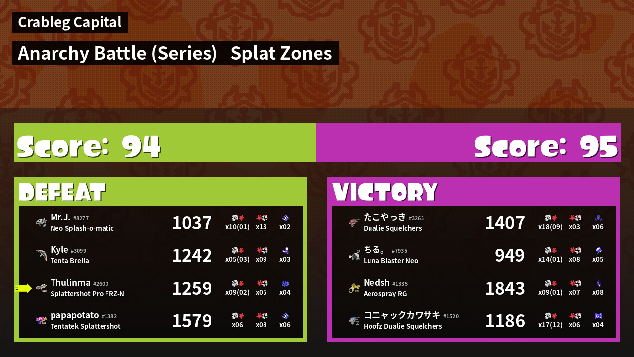 | Medals | #1 Splat Zone Guard #1 Splat Zone Hero #1 Ink Consumer | ||