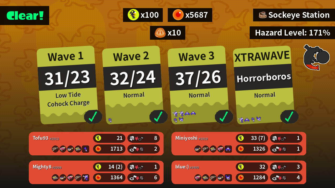 | Weapons | Squeezer Rapid Blaster Mini Splatling Dread Wringer | Mini Splatling Squeezer Dread Wringer Rapid Blaster | Rapid Blaster Dread Wringer Squeezer Mini Splatling | Dread Wringer Mini Splatling Rapid Blaster Squeezer |