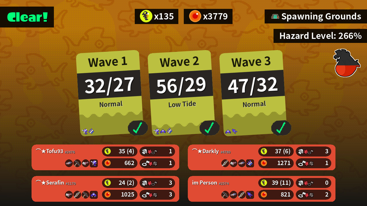 | Weapons | Splattershot Pro Undercover Brella Heavy Splatling | Undercover Brella Splattershot Pro Splatana Wiper | Splatana Wiper Heavy Splatling Splattershot Pro | Heavy Splatling Splatana Wiper Undercover Brella |