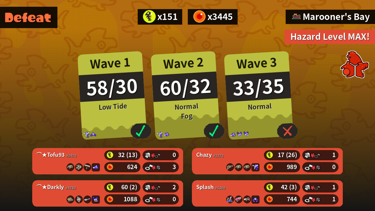 | Weapons | Splash-o-matic Grizzco Dualies Carbon Roller | Dread Wringer Tri-Stringer E-liter 4K | Slosher Rapid Blaster Blaster | Squeezer Splash-o-matic Splash-o-matic |