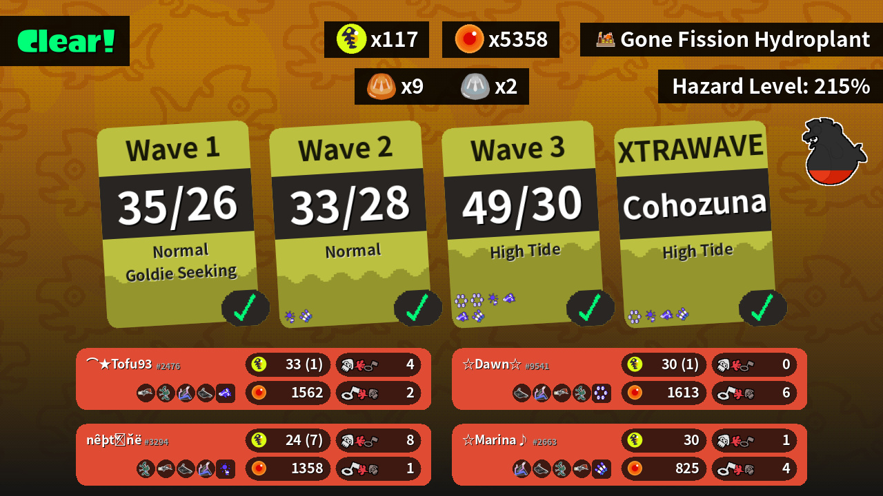 | Weapons | Range Blaster Wellstring V Slosher Bloblobber | Bloblobber Slosher Range Blaster Wellstring V | Slosher Bloblobber Wellstring V Range Blaster | Wellstring V Range Blaster Bloblobber Slosher |