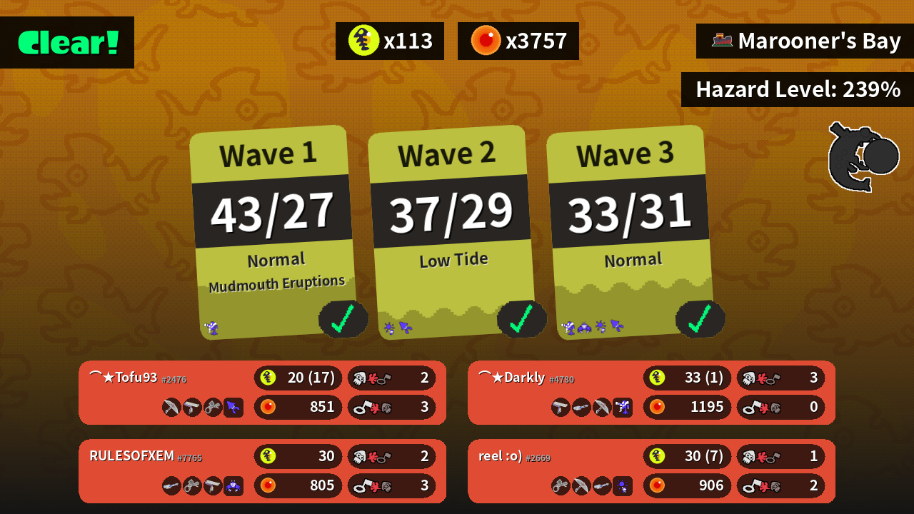 | Weapons | Splat Brella Splat Roller Aerospray MG | Splat Roller E-liter 4K Splat Brella | Aerospray MG Splat Brella E-liter 4K | E-liter 4K Aerospray MG Splat Roller |