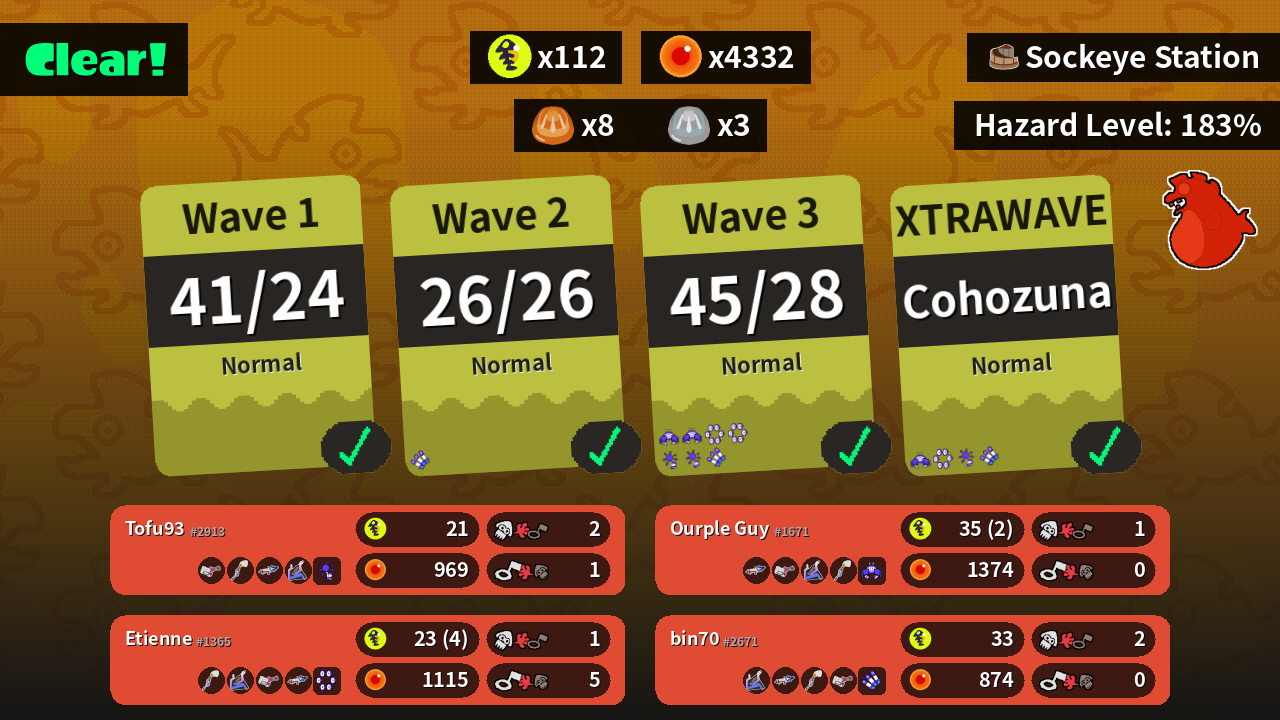 | Weapons | Heavy Splatling Inkbrush Splattershot Pro Slosher | Splattershot Pro Heavy Splatling Slosher Inkbrush | Slosher Splattershot Pro Inkbrush Heavy Splatling | Inkbrush Slosher Heavy Splatling Splattershot Pro |