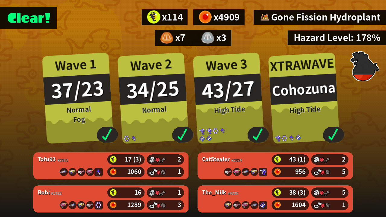 | Weapons | Splattershot Pro Splattershot Heavy Splatling Rapid Blaster | Heavy Splatling Rapid Blaster Splattershot Pro Splattershot | Splattershot Heavy Splatling Rapid Blaster Splattershot Pro | Rapid Blaster Splattershot Pro Splattershot Heavy Splatling |