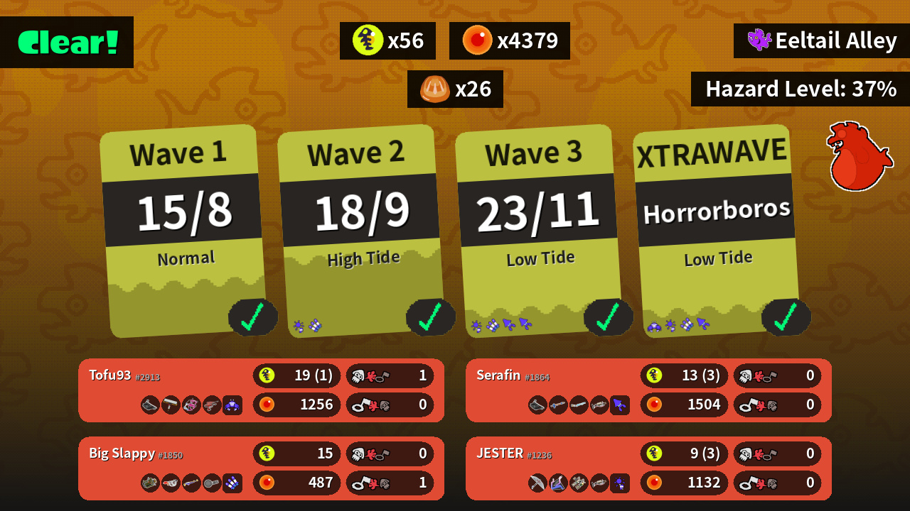 | Weapons | Bloblobber Carbon Roller Dapple Dualies Dualie Squelchers | Explosher Goo Tuber Splat Charger Nautilus 47 | Bloblobber Snipewriter 5H Classic Squiffer Grizzco Charger | Splat Brella Slosher Grizzco Dualies Grizzco Charger |