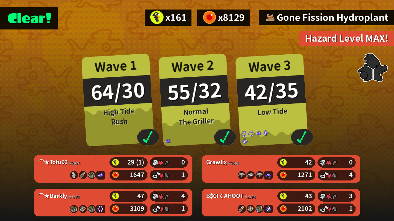 | Weapons | Grizzco Stringer Grizzco Splatana Grizzco Slosher | Grizzco Slosher Grizzco Dualies Grizzco Slosher | Grizzco Splatana Grizzco Dualies Grizzco Slosher | Grizzco Roller Grizzco Brella Grizzco Roller |