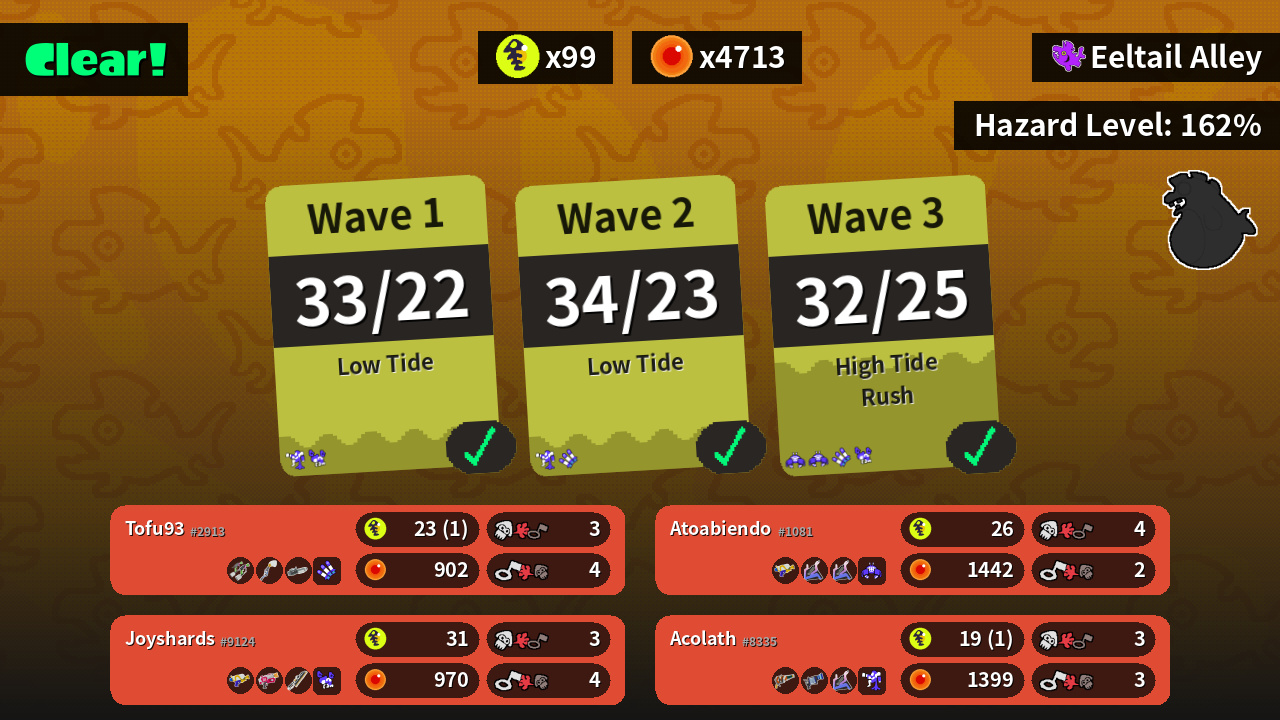 | Weapons | Splat Dualies Inkbrush Ballpoint Splatling | Splattershot Rapid Blaster Splatana Wiper | Splattershot Slosher Slosher | Squeezer L-3 Nozzlenose Slosher |