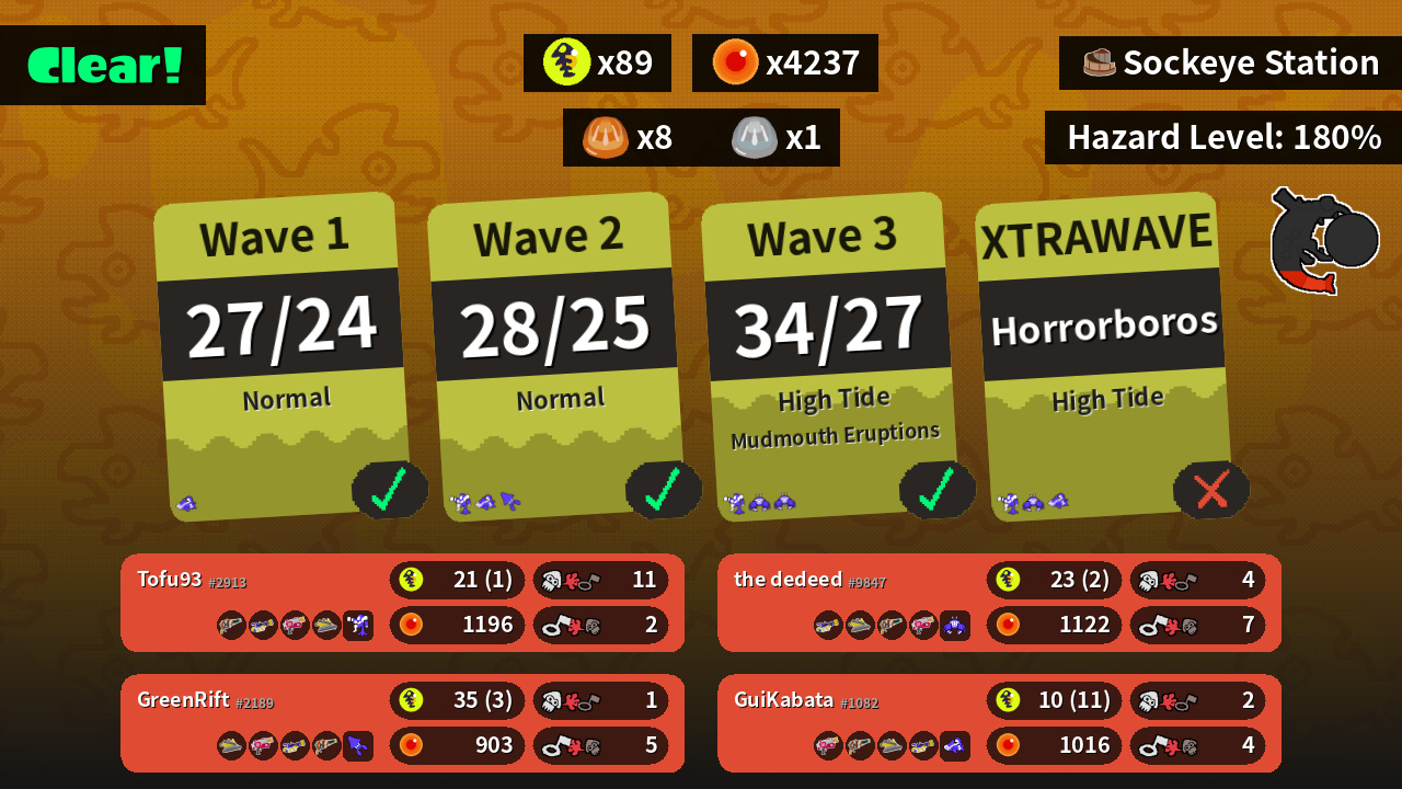 | Weapons | Squeezer Mini Splatling Rapid Blaster Dread Wringer | Dread Wringer Rapid Blaster Mini Splatling Squeezer | Mini Splatling Dread Wringer Squeezer Rapid Blaster | Rapid Blaster Squeezer Dread Wringer Mini Splatling |