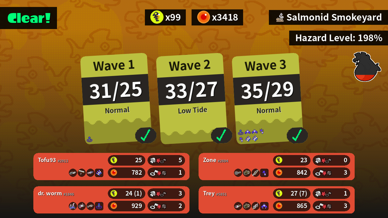 | Weapons | Ballpoint Splatling Carbon Roller Splattershot Pro | .96 Gal Explosher Dark Tetra Dualies | Slosher .52 Gal Grizzco Charger | Nautilus 47 Explosher Splatana Wiper |