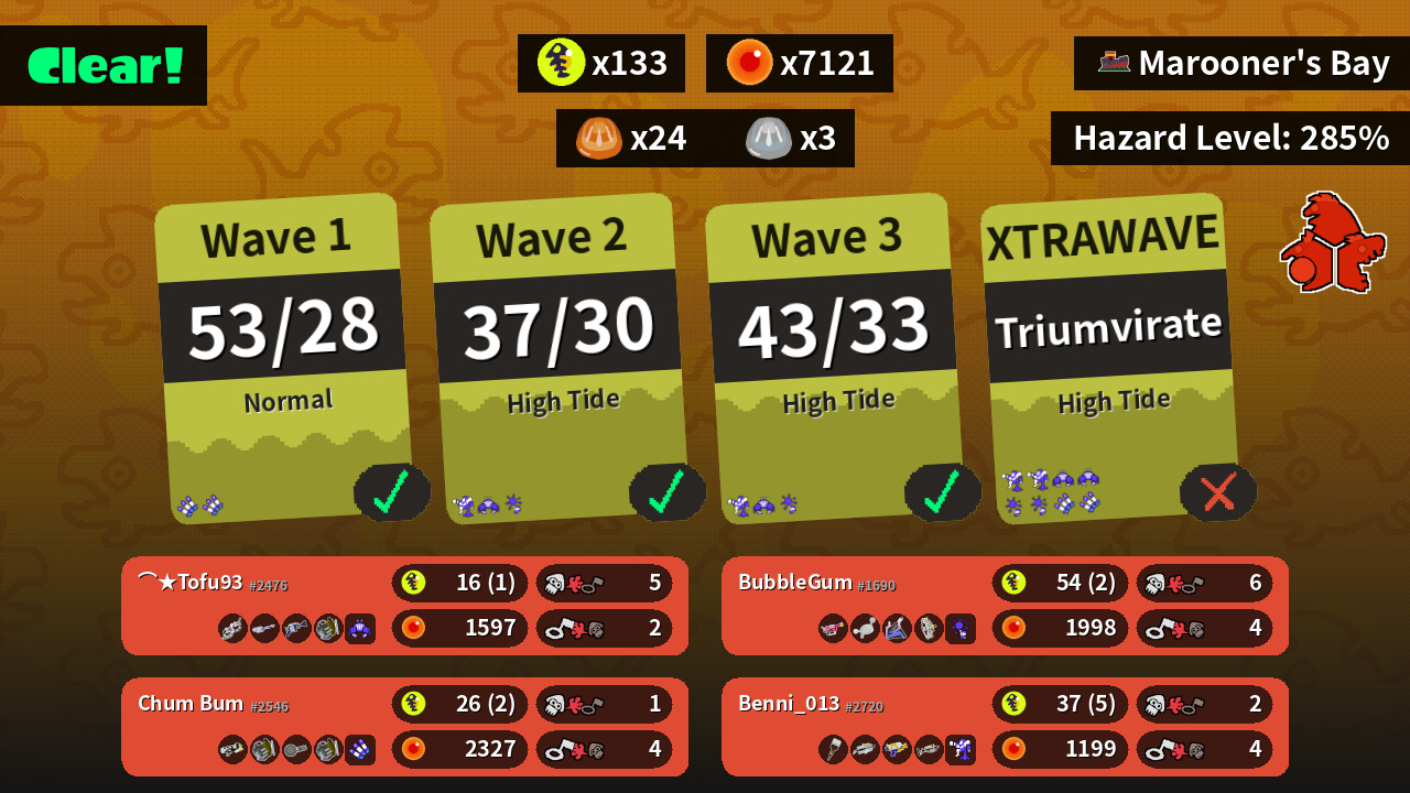| Weapons | Dark Tetra Dualies E-liter 4K H-3 Nozzlenose Grizzco Slosher | Rapid Blaster Pro Luna Blaster Slosher Grizzco Stringer | Octobrush Grizzco Brella Splattershot Grizzco Charger | Splattershot Nova Grizzco Slosher Nautilus 47 Grizzco Slosher |