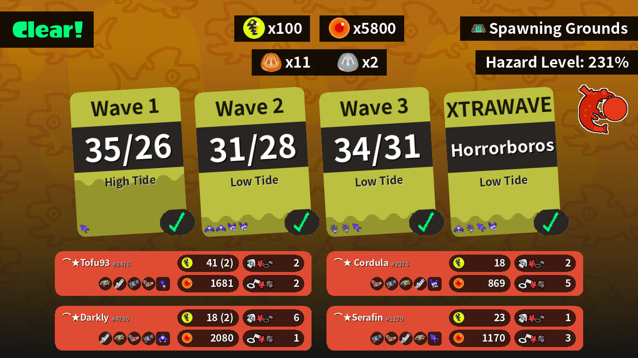 | Weapons |  Splash-o-matic  Mint Decavitator  L-3 Nozzlenose  Hydra Splatling |  L-3 Nozzlenose  Hydra Splatling  Mint Decavitator  Splash-o-matic |  Mint Decavitator  Splash-o-matic  Hydra Splatling  L-3 Nozzlenose |  Hydra Splatling  L-3 Nozzlenose  Splash-o-matic  Mint Decavitator |