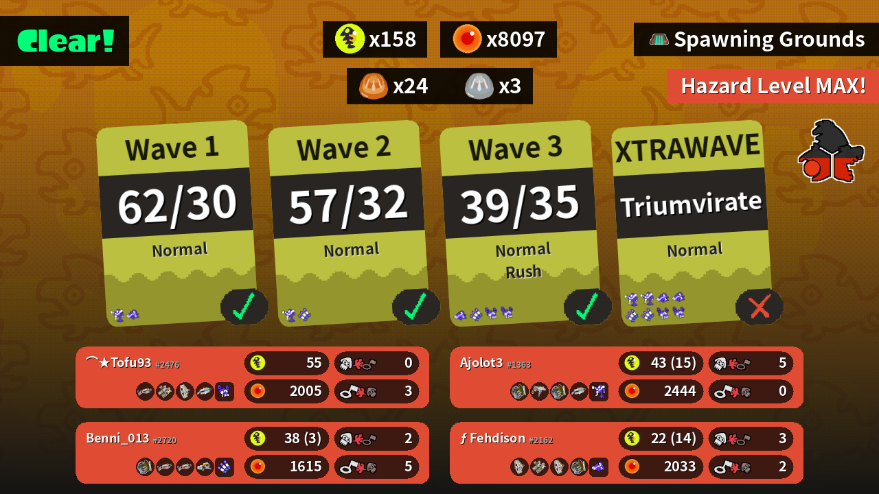 | Weapons | Grizzco Charger Grizzco Dualies Grizzco Stringer Grizzco Brella | Grizzco Slosher Grizzco Roller Grizzco Slosher Grizzco Brella | Grizzco Slosher Grizzco Charger Grizzco Charger Grizzco Blaster | Grizzco Stringer Grizzco Dualies Grizzco Stringer Grizzco Slosher |