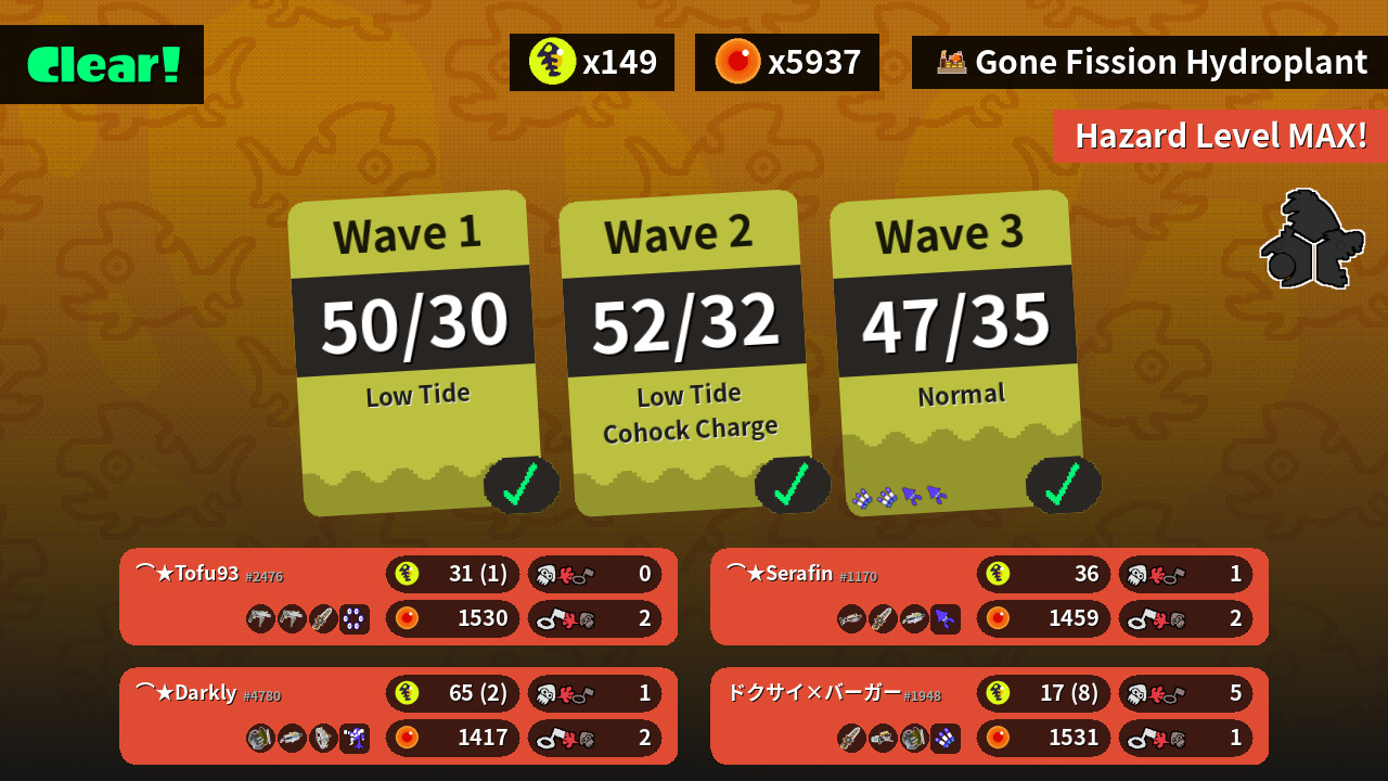 | Weapons | Grizzco Roller Grizzco Roller Grizzco Splatana | Grizzco Slosher Grizzco Brella Grizzco Stringer | Grizzco Charger Grizzco Splatana Grizzco Brella | Grizzco Splatana Grizzco Blaster Grizzco Slosher |