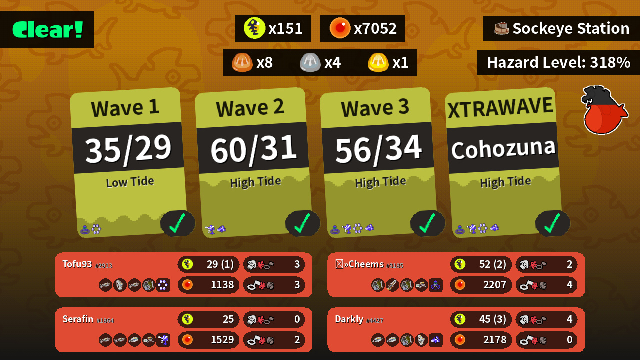 | Weapons | Grizzco Charger Grizzco Stringer Grizzco Charger Grizzco Slosher | Grizzco Slosher Grizzco Splatana Grizzco Slosher Grizzco Blaster | Grizzco Brella Grizzco Brella Grizzco Slosher Grizzco Stringer | Grizzco Charger Grizzco Charger Grizzco Brella Grizzco Blaster |