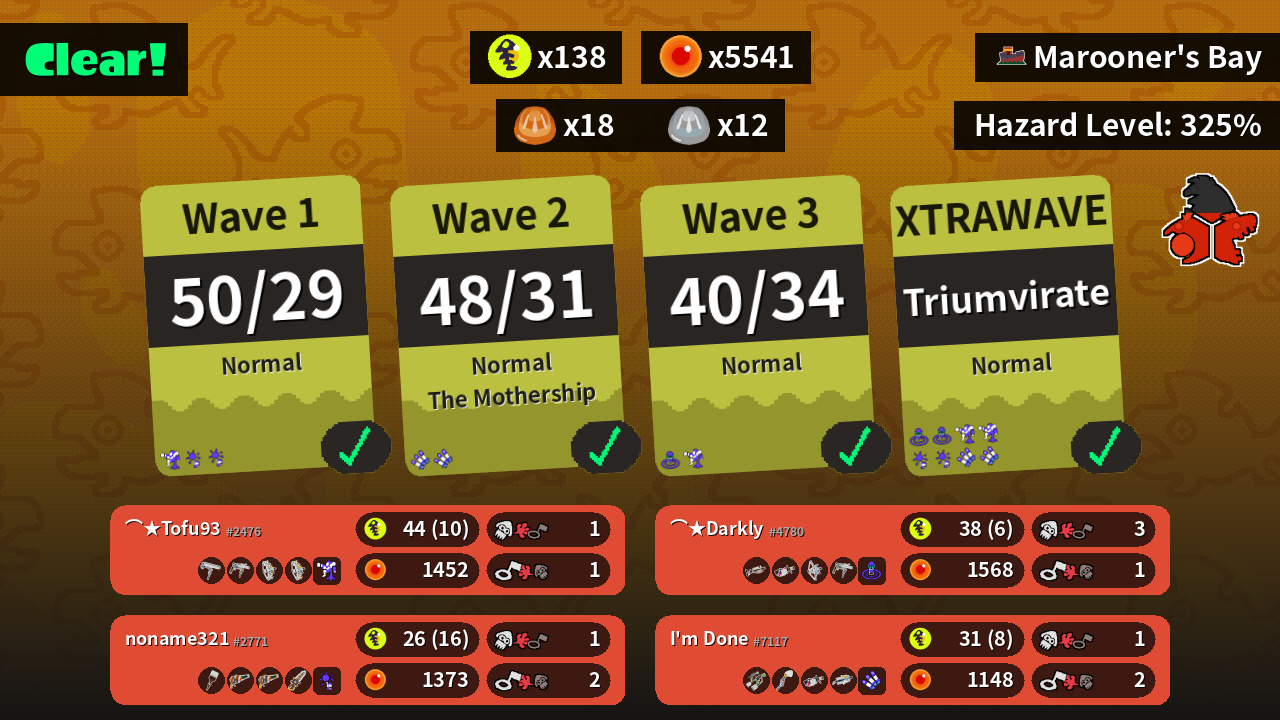 | Weapons | Dynamo Roller Grizzco Roller Grizzco Stringer Grizzco Stringer | Grizzco Charger .96 Gal Tri-Stringer Grizzco Roller | Splat Dualies Inkbrush .96 Gal Grizzco Brella | Octobrush Squeezer Squeezer Grizzco Splatana |