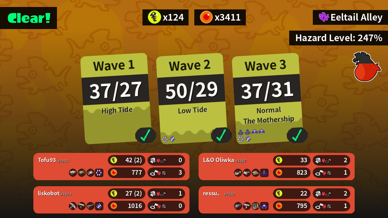 | Weapons | Splattershot Sploosh-o-matic .52 Gal | Mini Splatling Heavy Splatling Dread Wringer | Splat Brella Carbon Roller N-ZAP '85 | H-3 Nozzlenose Splat Roller Grizzco Slosher |