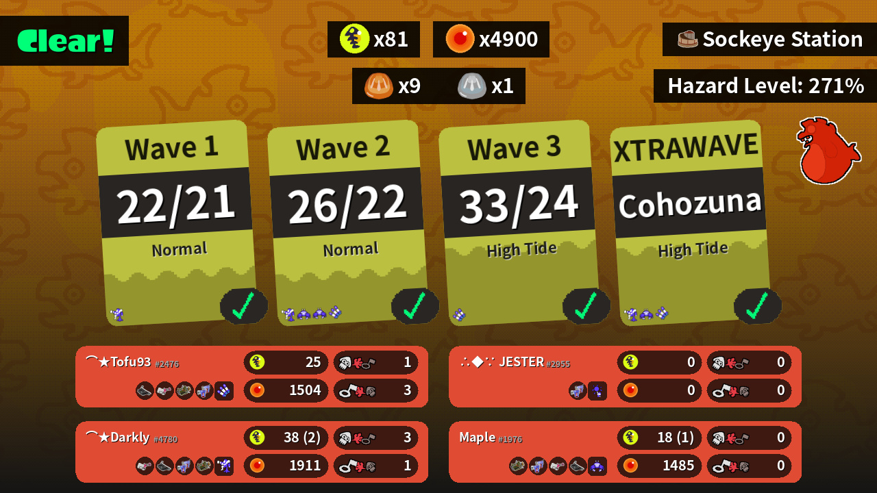 | Weapons | Bloblobber Heavy Splatling Explosher Glooga Dualies | Heavy Splatling Bloblobber Glooga Dualies Explosher | Explosher Glooga Dualies Heavy Splatling Bloblobber | Glooga Dualies ? ? ? |