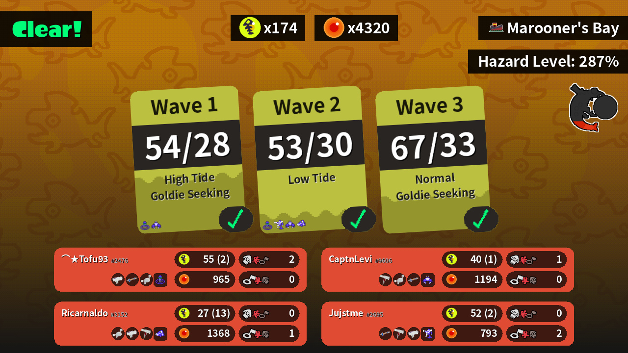 | Weapons | Splattershot Jr. Snipewriter 5H Luna Blaster | Snipewriter 5H Flingza Roller Splattershot Jr. | Flingza Roller Luna Blaster Snipewriter 5H | Luna Blaster Splattershot Jr. Flingza Roller |